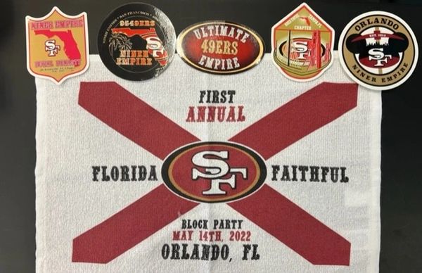 Swag Bag Includes Rally Towel, Florida Empire Group Patch, and Sticker logo of each Florida Chapter. $15 Pre-Order, $20 Day of Event. Pick up will be at the Orlando Niner Empire Booth Day of Event. Bring copy of your receipt. Must pick up in person, and supply is limited.
